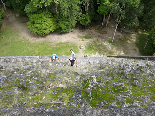 Worth a mention is Temple V. Still half-covered with vegetation, you're not supposed to climb it. There was a guy cutting the grass with a machete (standard in Guatemala), so I asked if we could climb a few steps. He surpassed all expectations when he ran up the steps, chucked a huge rope down, and invited us to all scramble up holding onto the rope, which he'd tied to a stone.